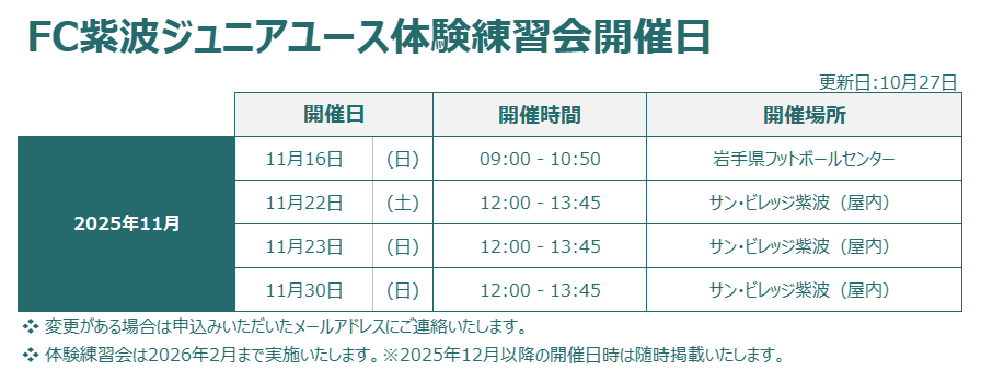 2025年11月9日(日) U13活動変更について (更新日 11月4日) |